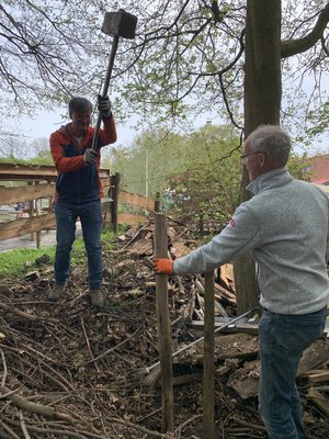 Afgelopen zaterdag 11 april 2026 heeft de Lions Club Delft haar jaarlijkse Doedag gevuld met diverse klussen bij de Stadsboerderij BuytenDelft aan de Korftlaan in Delft. Zo is er een gedeelte van de takkenwal verstevigd met een houten hek, is er een wand geschilderd in de hooiberg, is het houtwerk van een aantal tafels geschuurd om beteitst te worden en is er een hagenboog aangelegd.